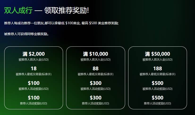 还最低推荐活动入金200美元交易5笔订单即可获得50美元奖励